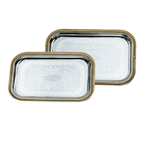 Odyssey™ Serving Tray, large, rectangular, chrome plated, with decorative engraving on base of tray & decorative brass plated gold-tone rim, 18-1/4" x 12-1/3", imported (not dishwasher safe)