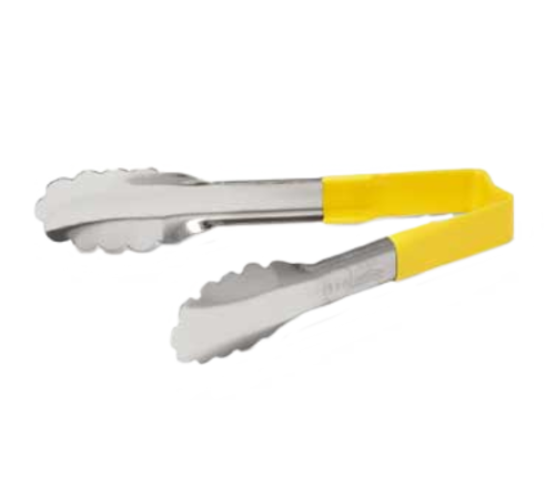 Utility Tongs, one-piece, 6" (24.1 cm), scalloped teeth, springless design, yellow ergonomic antimicrobial Kool-Touch® handle (heat resistant to 225°F (107.2°C), heat resistant to 180° F (82.1 C), fully functional to 350° F (176.6 C), dishwasher safe, stainless steel, NSF, Made in USA, Jacob's Pride® Collection, Limited Lifetime Warranty