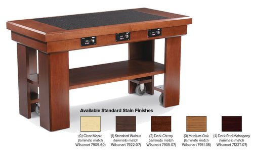 Induction Table, solid maple table (dark cherry color) with ceramic counter (black granite color) with (4) Mirage® 5950145 under counter induction warmers, 450W, 5-20P, 5-level controls on front face of table, 76"W x 30"D x 36"H (including casters), reference Wilsonart® color 7935-07 for table stain color, (contact Vollrath for lead time) Made in USA