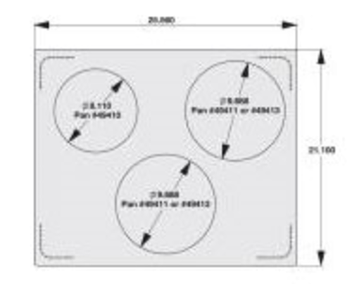 Miramar™ Double Size Template for Miramar™ Cookware, stainless steel plain edge, has (3) round cutouts, accommodates (1) 49410 3 quart,casserole, (1) 49413 10" Saute Pan & (1) 49411 5 quart,casserole, overall dimension 21-1/8" x 25-3/4", Made in USA (contact Vollrath for lead time), made to order, cannot be cancelled or returned