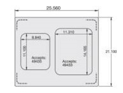 Miramar™ Double Size Template for Miramar™ Cookware, stainless steel satin edge, has (1) large & (1) small food pan cutouts, accommodates (1) 49435 Small Food Pan with handle, & (1) 49433 Large Food Pan with handle or (1) 49432 pan without handles, overall dimension 21-1/8" x 25-3/4", Made in USA (contact Vollrath for lead time), made to order, cannot be cancelled or returned