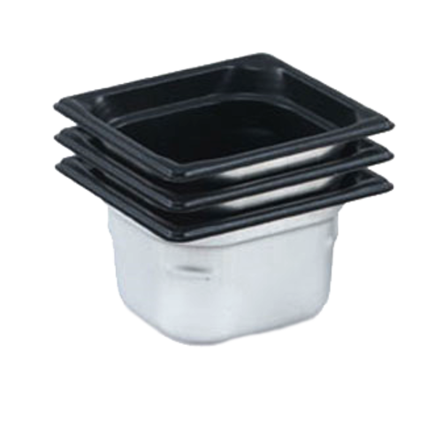 (DISCONTINUED upon depletion of stock, contact factory for availability) Super Pan 3® 1/6 GN Food Pan, 4" deep, (100mm), 1.7 qt capacity, 22/300 series stainless steel with black SteelCoatX3 coating, non-stick, top flange corners with concave indentation, Anti-Jamming, reverse form flattened edge, framing shoulder, interchangeable with SPV plastic pan line, meets gastronorm (EN 631-1) standard, NSF, Made in USA