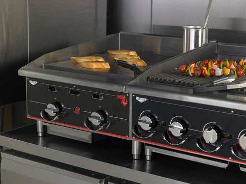 Cayenne® Heavy-Duty Griddle, 24", 60,000 BTU, Manual Control, stainless 2 burners placed every 12" for 30,000 BTU per 12" cooking surface, polished surface 1" thick plate, 24" cooking surface depth, stainless burner construction, stainless exterior, 5" sloped side splashes, 5" backsplash, shipped set up for natural gas, includes kit for conversion to propane, includes regulator & gas valve, metal knobs/ with heavy duty knob guards, front grease trough, grease drawer with baffles, 4" adjustable legs, Model FTG2024, NSF, cETLus, imported