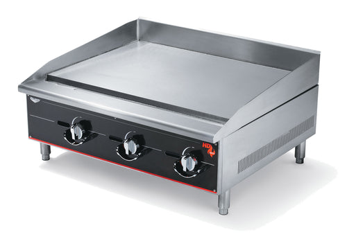 Cayenne® Heavy-Duty Griddle, 36", 90,000 BTU, Manual Control, stainless 3 burners placed every 12" for 30,000 BTU per 12" cooking surface, polished surface 1" thick plate, 24" cooking surface depth, stainless burner construction, stainless exterior, 5" sloped side splashes, 5" backsplash, shipped set up for natural gas, includes kit for conversion to propane, includes regulator & gas valve, metal knobs/ with heavy duty knob guards, front grease trough, grease drawer with baffles, 4" adjustable legs, Model FTG2036, NSF, cETLus, imported