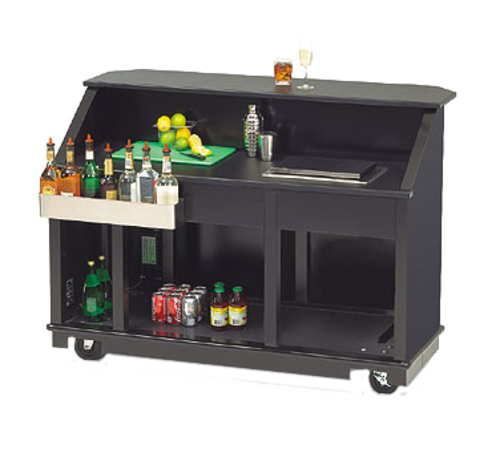 Straight Bar, 61-1/2"W, standard black package, pre-painted black ACM (aluminum composite material), constructed base & toe kick, black polyform countertops (NSF certified), open storage, 1" black bumper molding, (6) 3" swivel casters (2 with locking brakes), (1) stainless steel speedrail mounted on right or left side of work area, includes (1) each: 8" full-size metal pan, false bottom & cover