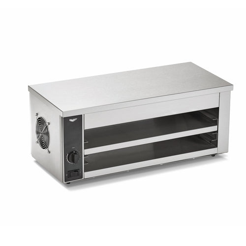 Cheese Melter, countertop, electric, 26-1/4"W x 12-1/8"D x 11-3/8"H, adjustable shelf with (5) positions, 20-1/4" product opening, quartz heaters, 15-minute timer, standby mode, stainless steel construction, 120v/60/1-ph, 1.65kW, 13.8 amps, NEMA 5-15P, NSF, cULus, Made in USA (model JW2)