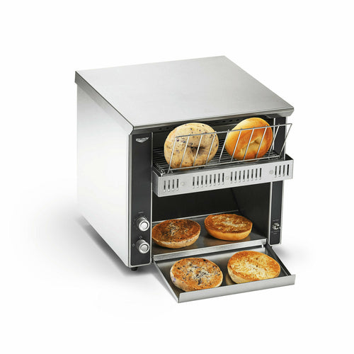 Conveyor Bagel & Bun Toaster, horizontal conveyor, (400) bagels halves or buns per hour, non-adjustable 2-1/8" opening, 10-1/2"W belt (2 slice), forced convection toasting, variable speed control, top & top-bottom heat switch, quartz heaters, standby mode, stainless steel & aluminized steel construction, 1" adjustable legs, 120v/60/1-ph, 1.6kW, 13.3 amps, cord with NEMA 5-15P, NSF, cULus, Made in USA (model JT1BH)