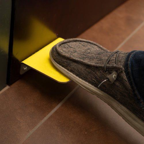 Hands-Free Foot Door Opener, 6-1/4" x 8-1/4" x 4-1/2", includes black grip tape on surface, instruction label & hardware, stainless steel, natural finish