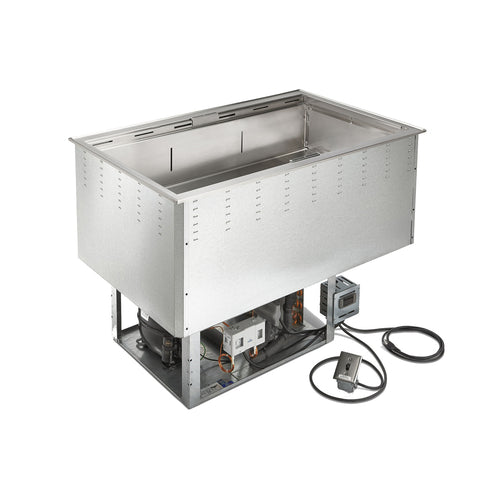 Refrigerated Cold Food Well Unit, drop-in, 4-well, 54-3/4"W x 25-1/4"D x 28-5/8"H, (overall), holds pans up to 7" deep, dual forced air cooled, remote mounted on-off switch,18/300 series stainless steel top & interior well, galvanized exterior, self-contained refrigeration, 3/4" integral drain, includes positioning clips, 1/3 HP, 120v/60/1-ph, 6.0 amps, NEMA 5-15P, cULus, NSF, Made in USA (contact Vollrath for lead time)