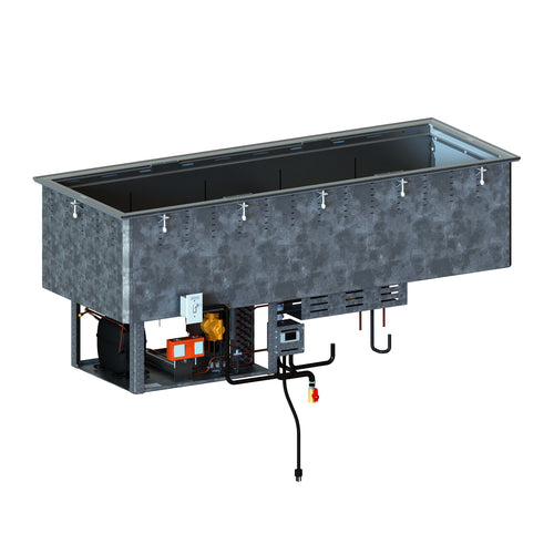 Refrigerated Cold Food Well Unit, drop-in, 5-well, 68"W x 25-1/4"D x 28-5/8"H, (overall), holds pans up to 7" deep, dual forced air cooled, remote mounted on-off switch,18/300 series stainless steel top & interior well, galvanized exterior, self-contained refrigeration, 3/4" integral drain, includes positioning clips, 1/2 HP, 120v/60/1-ph, 9.0 amps, NEMA 5-15P, cULus, NSF, Made in USA (contact Vollrath for lead time)