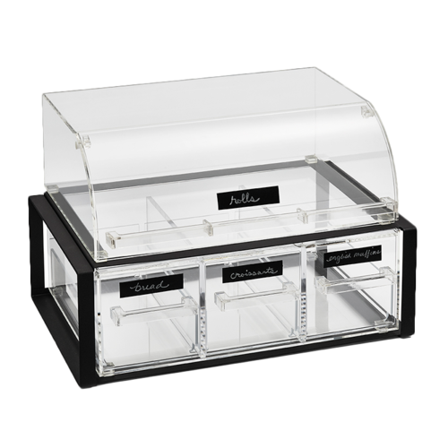 Cubic Acrylic Display System Set, 22-3/8"W x 14-1/2"D x 15-1/4"H, includes: (1) metal black frame, (1) full case curve nose case (#NBC11), full case with (3) drawers (#SBB33), (1) pan #5303NS, (16) reusable chalk labels & (1) box of white chalk, NSF (sold by case only)