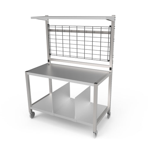 Delivery Center, 48"W x 30"D, stainless steel top work surface & overshelf, accessory grid, delivery bag/carrier storage space, inner-frame electrical conduit, stainless steel under shelf & legs, casters (2 locking), Made in USA (Made To Order) (contact factory for price)