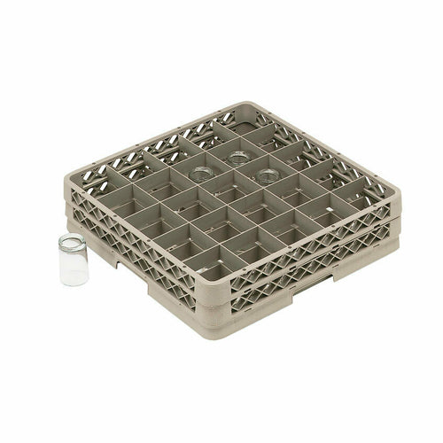 Traex® Full Size Low Profile Glass/Stemware Rack, (25) compartment, 3-1/2" square compartment size, with (2) (25) compartment extender, open bottom & sidewall, 3-5/8" maximum inside height, handles on all (4) sides, co-polymer plastic, full size (19-3/4" x 19-3/4") double wall construction, snap-fit extenders, NSF, Made in USA (rack base (TR13) is available in beige only, note: low profile racks can not be imprinted)