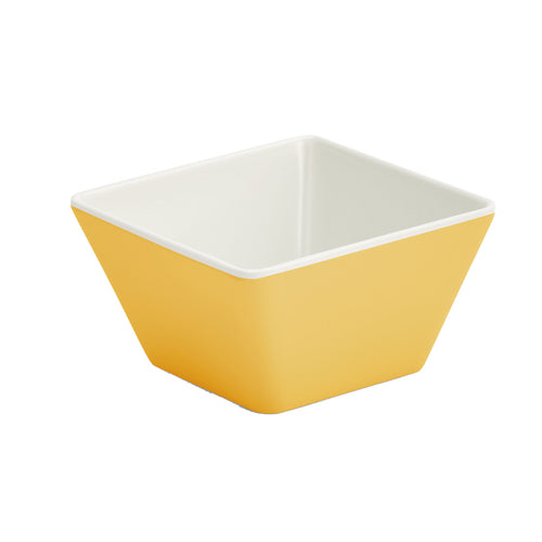 (DISCONTINUED upon depletion of stock, contact factory for availability) Melamine Bowl, XS square, Yellow. 1/8 QT. 3 1⁄2" W x 3 1⁄2" L x 2 1⁄8" H. Dishwasher safe.