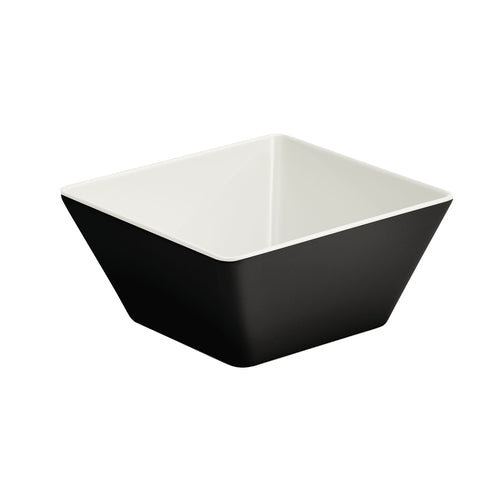 Melamine Bowl, Medium square, Black. 1 9/16 QT. 7 1⁄16" W x 7 1⁄16" L x 3 5⁄16" H. Dishwasher safe.