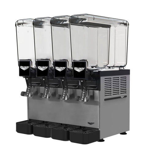 Vollrath Pre-Mix Refrigerated Beverage Dispenser, electric, agitator bowl circulation, (4) 2.1 gallon polycarbonate food grade bowls, 35° to 41°F temperature range, (1) thermostat per bowl, rocker controls, stainless steel unibody cabinet, gravity fed, stainless steel spigot, ABS plastic drip trays, R134a, 115v/60/1-ph, 4.9 amps, NEMA 5-15P, cETLus, NSF