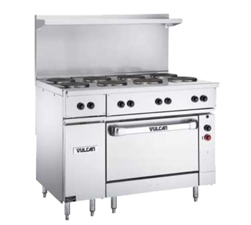Restaurant Range, electric, 48", (8) 2.0 kW French hotplates, 9-1/2" round, infinite controls, (2) standard ovens, stainless steel front, sides, single-deck high shelf & 6" legs, 208v