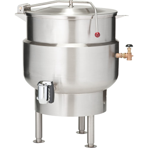 Tilting Kettle, Direct, 40-gallon true working capacity, 2/3 jacketed, 316 series stainless steel liner with ellipsoidal bottom, manual tilt, faucet bracket on tilting console, stainless steel construction, tri-leg base, steam control assembly, 50 psi, 1.0 BHP
