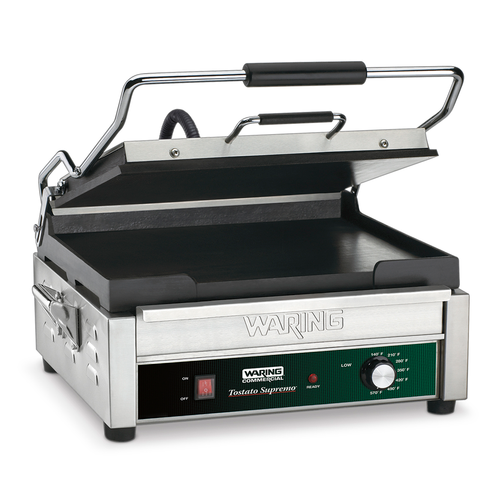 Tostato Supremo® Panini Grill, full size, 14"x14" flat cast iron cooking surface, hinged top, adjustable thermostat to 570°F (300°C), power & ready indicator lights, heat-resistant handles, brushed stainless steel body & removable drip tray, 220-240v/50-60/1-ph, type G plug, CE, RoHS, SASO, UK, FOR INTERNATIONAL USE ONLY (contact company for price)