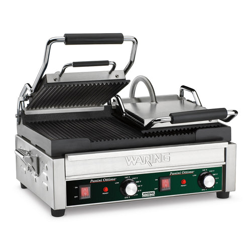 Panini Ottimo™ Dual Panini Grill, electric, double, 17" x 9-1/4" cooking surface, hinged auto-balancing top plate with heat resistant handles, ribbed cast iron plates, adjustable thermostats 570°F (300°C), indicator lights, brushed stainless steel body & removable drip tray, 220-240v/50, type G plug, CE, RoHS, UK, FOR INTERNATIONAL USE ONLY (contact company for price)