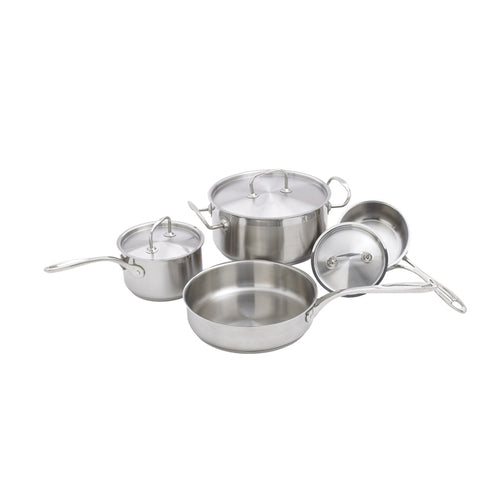 Premium Induction Cookware Set, 7-piece, includes: 1 qt. covered sauce pan, 2 qt. covered sauce pan, 5 qt. Dutch oven & 9-1/2" sauté pan, riveted handles, extra heavy weight, 18/8 stainless steel, with aluminum core, NSF (Qty Break = 2 set)