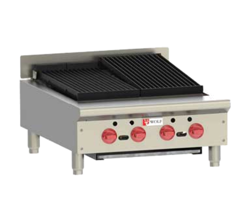 Achiever Charbroiler, 25-1/8" W, countertop, (4) cast iron 17,000 BTU burners with standing pilots & cast iron radiants, heat deflector tray, supercharger burner dividers, high range infinite heat control valves, fully welded chassis, stainless steel front, sides, top trim, backsplash & grease trough, cast iron top grates, 4" adjustable legs, 68,000 BTU, CSA, NSF