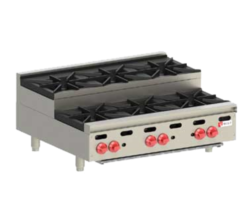 Achiever Hotplate, gas, 36", countertop, (3) 30,000 BTU open burners, (3) 30,000 BTU step-up open burners, lift-off burner heads, protected standing pilots, cast iron top grates, manual gas valve controls, stainless steel front, sides & backsplash, aluminized pull out crumb tray, 4" adjustable legs, 180,000 BTU, CSA, NSF