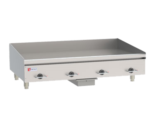Heavy Duty Electric Griddle, 48" W x 24" D cooking surface, 1/2" thick polished steel griddle plate, bottom mounted snap action thermostat every 12", countertop, stainless steel front, sides, front top ledge with "Cool Bullnose", front grease trough, back & tapered side splashes, 11-1/8" cooking height on 4" adjustable legs, UL, NSF