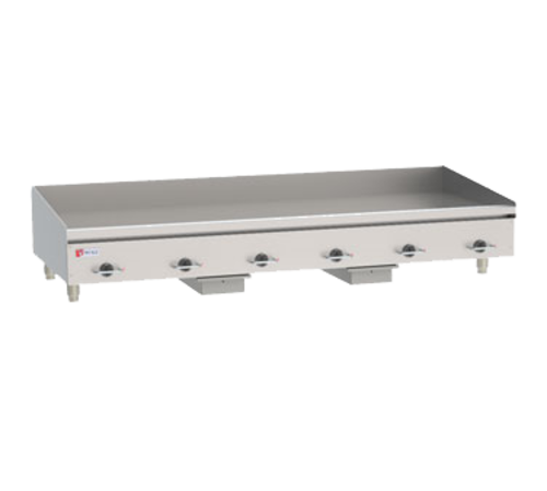 Heavy Duty Electric Griddle, 72" W x 24" D cooking surface, 3/4" thick polished steel griddle plate, bottom mounted snap action thermostat every 12", countertop, stainless steel front, sides, front top ledge with "Cool Bullnose", front grease trough, back & tapered side splashes, 11-1/8" cooking height on 4" adjustable legs, UL, NSF